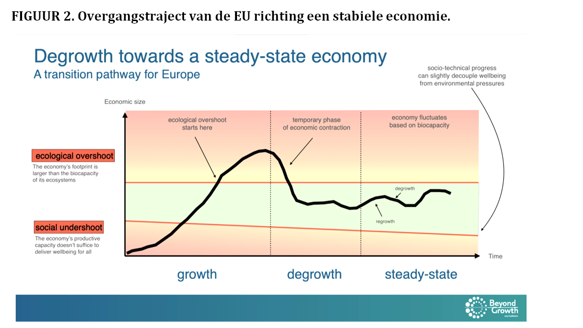 De EU dient haar economisch beleid dus te heroriënteren. Weg van het blind vervolgen van meer groei en een hoger BBP, naar een beleid gericht op het tijdelijk ontgroeien van delen van haar economie om uiteindelijk te landen bij een stabiele economie die rekening houdt met zowel de ecologische limieten als de sociale fundamenten (zie FIGUUR 2).2 Vergelijk het met een tijdelijk dieet voor onze obese economie, waarbij we afstappen van slechte gewoontes en in ruil plaatsmaken voor datgene wat ons echt gelukkig maakt.