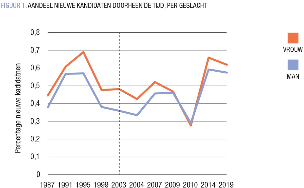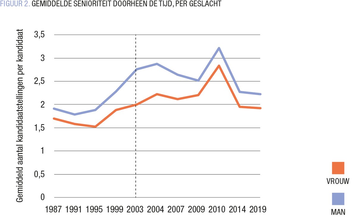 We zien ook dat het kandidatenverloop inderdaad altijd hoger is bij vrouwen dan bij mannen. Het aandeel nieuwe kandidaten is hoger bij de vrouwen, terwijl de gemiddelde senioriteit lager is. Op het eerste zicht liggen deze vaststellingen dus in de lijn van de offerlam-hypothese. Dat wordt ook bevestigd door het feit dat de invoering van de stringente 50-50 quotawetgeving vanaf 2003 (stippellijn in figuren) gepaard gaat met een groter verschil in kandidatenverloop. In beide grafieken neemt de afstand tussen de curves voor mannen en voor vrouwen toe. Maar op de lange termijn lijkt dit toegenomen verschil in kandidatenverloop opnieuw uit te vlakken. Zeker vanaf 2014 gaan de gendercurves in beide grafieken terug parallel lopen en is de afstand tussen de curves voor mannen en vrouwen zeer vergelijkbaar met die in de jaren 1980 en 1990.