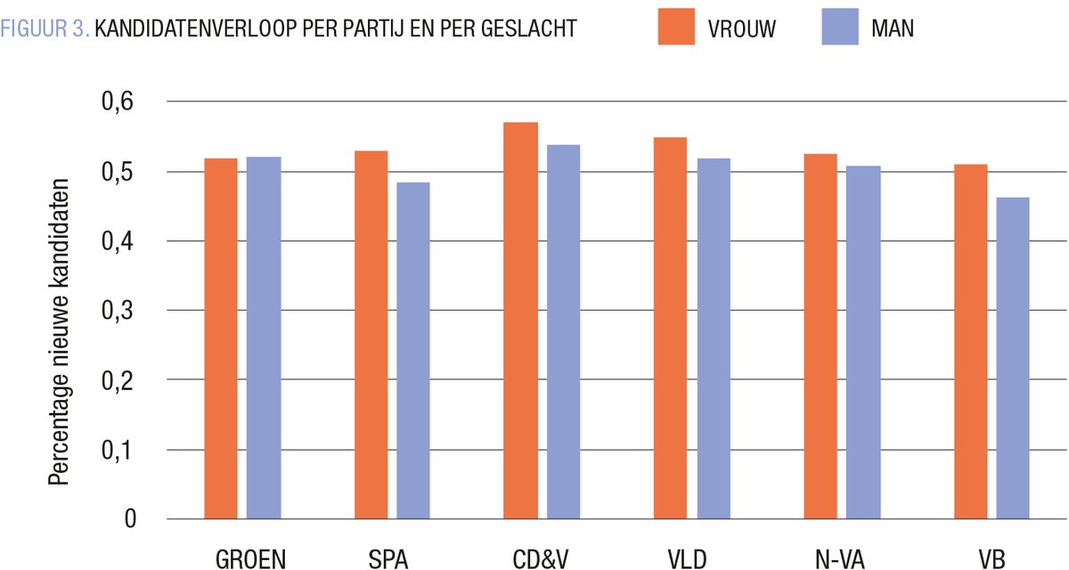 Om genderpatronen in kandidatenverloop te analyseren, maken we gebruik van een omvattende dataset die alle kandidaten behelst van Vlaamse partijen vanaf 1987 tot en met 2019. We beperken ons daarbij tot de partijen die gedurende deze periode constant vertegenwoordigd waren in het parlement, hetzij voor het regionaal, het federaal of het Europees niveau, weliswaar onder verschillende benamingen. Concreet gaat het om de volgende partijen: Agalev-Groen (Groen), SP-Vooruit (SPA), CVP-CD&V (CD&V), VLD-Open VLD (VLD), VU-N-VA (N-VA), Vlaams Blok-Vlaams Belang (VB). In totaal omvat deze dataset 18.393 kandidaatstellingen en 9.905 kandidaten.