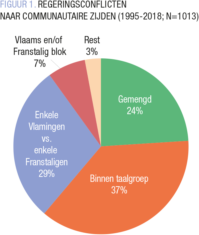 Dergelijke communautaire spanningen zijn een gigantisch blok aan het been van Belgische politici. In totaal zijn 17% tot 29% van alle regeringsconflicten communautair van aard (afhankelijk van de dataset). Gemiddeld geraken coalitiepartners om de twee à drieënhalve maand verzeild in een nieuw communautair conflict. De meeste spanningen zijn evenwel op andere breuklijnen te vinden – denk aan onenigheden over de sanering van de overheidsfinanciën, clashes over ons buitenlands beleid of gevoelige conflicten over levensbeschouwelijke kwesties zoals abortus of euthanasie. Niet ‘alles’ is communautair, maar wel veel. De meeste regeringsconflicten (zo’n 60%) worden bovendien uitgevochten tussen taalkundig gemengde zijden of binnen taalgroepen (bijvoorbeeld onder Vlamingen) (FIGUUR 1). Van de communautaire demarches die de Volksunie lanceerde ten aanzien van de ‘slabakkende’ CVP (Martens VIII) tot de bijna dagelijkse boksmatches tussen de Franstalige liberalen en sociaaldemocraten: de Belgische politiek is geen constante loopgravenoorlog tussen een Vlaams en Franstalig bok. Ook in België is er veel ruimte voor wisselende allianties: de medestander in het ene dossier is de tegenstander in het andere. Die ‘tension-reducing coalitions’ verzachten het communautair vijandsbeeld en werken volgens de literatuur stabiliserend. Conflicten waarbij alle Vlamingen en Franstaligen lijnrecht tegenover elkaar staan, zoals bij BHV, zijn eerder zeldzaam (<10%). Ze springen echter sterk in het oog, waardoor we hun aanwezigheid dreigen te overschatten.