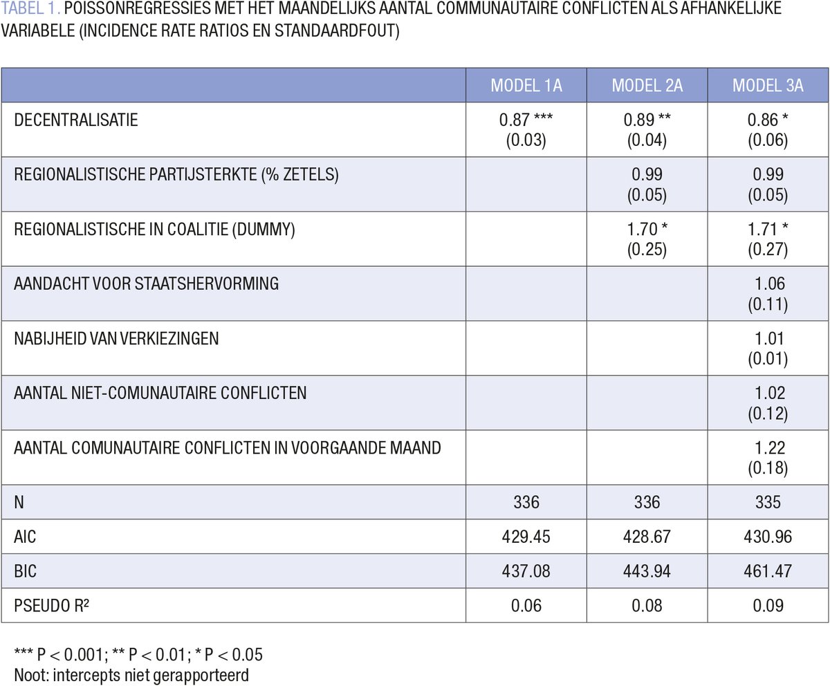 Ooit was het communautaire het zwaarste blok aan het regeringsbeen. Nu is het slechts een kiezel in de schoen. Zaten de staatshervormingen daar voor iets tussen? Een uitgebreide reeks statistische regressieanalyses toont aan dat decentralisatie effectief gelinkt is aan communautaire pacificatie in de federale regeringen (TABEL 1). Decentralisatie, de toename van deelstaatautonomie, is niet enkel significant gelinkt aan een afname van het maandelijks aantal communautaire conflicten, maar ook aan lagere kansen dat conflicten die nog opduiken communautair van aard zijn, over communautaire thema’s gaan en worden uitgevochten langs communautaire lijnen. Deze bevindingen houden stand na controle op derde factoren. Het institutionaliseren van verschillen weerhoudt politici er dus niet van de kloven te overstijgen – integendeel.
