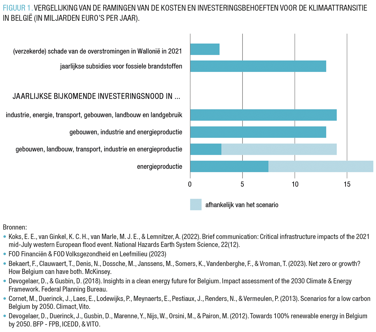 Voor België zijn verschillende (gedeeltelijke) ramingen beschikbaar, die de extra investeringen voor koolstofneutraliteit in de periode 2020-2050 tussen 2 en 3% van het bbp inschatten (11 tot 16 miljard euro/jaar in huidige prijzen). Hoewel ze in FIGUUR 1 worden samengebracht, zijn de studies niet perfect vergelijkbaar omdat ze verschillen in de sectoren die ze meenemen, de variabelen in het model, het vooropgestelde ambitieniveau en de gehanteerde tijdlijn, maar ze liggen verhoudingsgewijs in lijn met uitkomsten voor onze buurlanden.