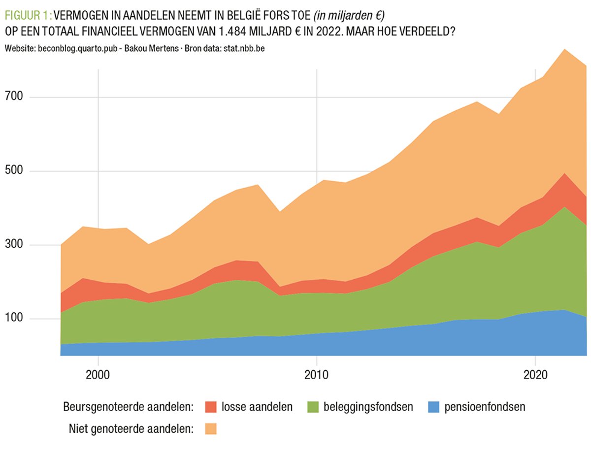 Ondertussen is geweten dat vermogen uiterst ongelijk verdeeld is. Zo vindt de Nationale Bank (NBB) dat de top 10% Belgische huishoudens zo’n 55% van het totale vermogen bezit.3 Maar dit totale vermogen bestaat voor meer dan de helft uit vastgoed4, waarvan we weten dat het veel gelijkmatiger verdeeld is over de bevolking (de top 10% bezit slechts zo’n 30% van het residentiële vastgoed). Financieel vermogen daarentegen – zo’n 1.484 miljard euro in 2022, of drie keer het bbp – is vele malen ongelijker verdeeld dan vastgoed. Ten slotte is het bezit van aandelen nog ongelijker verdeeld dan financieel vermogen in het algemeen aangezien er wel wat mensen zijn met een flinke spaarrekening, maar heel weinig mensen met een flinke beleggingsportefeuille. Zo stelt de NBB dat de top 10% vermogenden zo’n 80% van de beursgenoteerde aandelen in handen hebben (en de ‘armste’ 70% van de bevolking moet het stellen met 2% van de aandelen). De verdeling van beleggingsfondsen en de pensioenfondsen – die grotendeels uit aandelen bestaan5 - zal ergens tussen die 55% en 80% in zitten, terwijl de verdeling van niet-beursgenoteerde aandelen waarschijnlijk nog ongelijker verdeeld zijn. Deze zijn immers enkel toegankelijk voor professionele beleggers of in handen van families. Ten slotte is het ook belangrijk om in te zien dat dit uiterst ongelijk verdeelde financieel vermogen vooral voortkomt uit erfenissen of schenkingen, en niet per se uit hard werken.6
