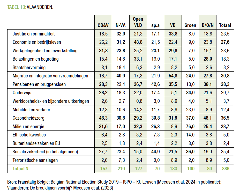 Ook in Vlaanderen komt gezondheidszorg als belangrijkste thema uit de bus, maar het vormt opnieuw geen strijdpunt tussen de partijen. In tweede instantie sturen migratie en integratie het stemgedrag. Vlaams Belang- (41%) en N-VA-kiezers (55%) zijn hier toonaangevend. Dan volgen milieu en energie, thema’s die vooral Groen-kiezers (76%) belangrijk vinden. Het is pas in derde instantie dat sociaaleconomische thema’s de kiezers beroeren. In 2019 was dus de culturele open-universalistisch/gesloten-particularistisch breuklijn dominant geworden in Vlaanderen, terwijl dit in de verkiezingen van 2010 en 2014 nog de sociaaleconomische breuklijn was.