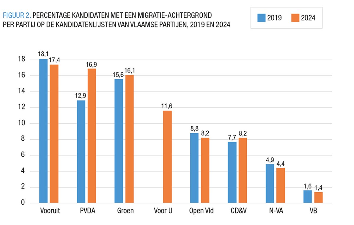 Centrumpartijen (CD&V en Open Vld) scoren een stuk lager met ongeveer 8%. De rechtse partijen N-VA en Vlaams Belang volgen nog een eind verderop met respectievelijk 4,4% en 1,4%. De nieuwe partij Voor U scoort opvallend hoog met ongeveer 11% van haar kandidaten die een migratie-achtergrond hebben. Mogelijk zorgt het feit dat dit een nieuwe partij is ervoor dat er meer kansen zijn voor nieuwkomers (in de brede zin van het woord).
