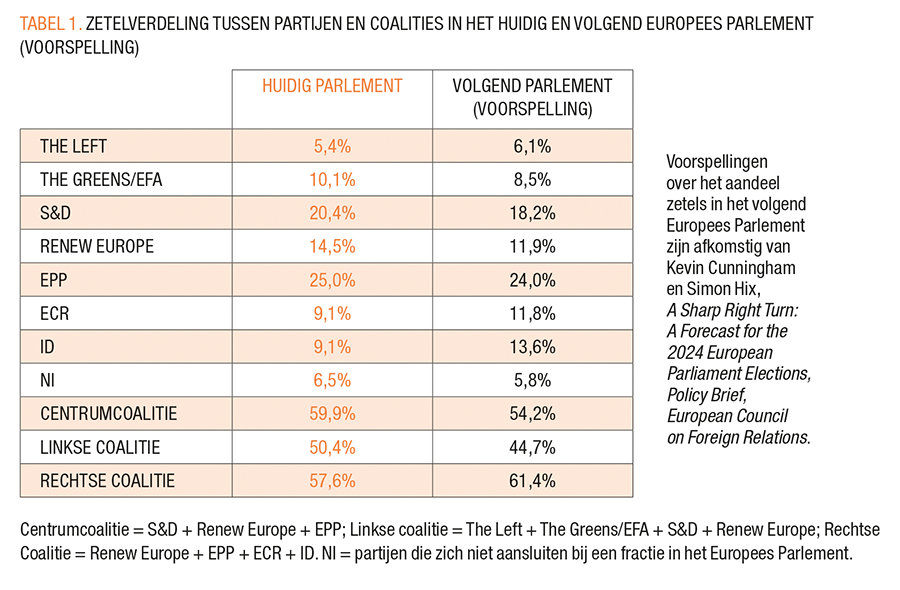 Volgens alle analisten die op basis van peilingen voorspellingen doen over de zetelverdeling in het volgende Europese Parlement komt er een stevige ruk naar rechts. Op The Left na staan alle linkse partijen op verlies en hun verloren zetels gaan integraal naar de rechtse Europese Conservatieven en Reformisten (ECR) en, vooral, naar de extreemrechtse Identity and Democracy (ID) fracties (TABEL 1).