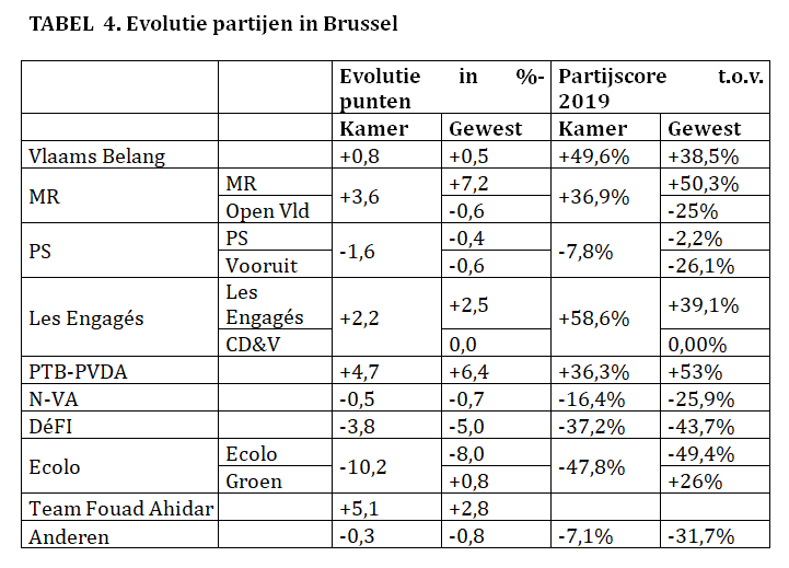 - De vertrekkers onder de Ecolo-kiezers gingen niet naar dezelfde partijen als in Wallonië. De partij die het meest profiteert is PS (12,5%). Dit zorgde niet voor winst voor PS, omdat ze zelf slachtoffer werd van aanzienlijk vertrek van kiezers naar PTB-PVDA. PS verloor terrein in het noorden en westen van Brussel en won in de gemeenten in het zuid-oosten. MR profiteerde van de komst van 12% Ecolo-kiezers, Les Engagés haalde 8% van hen binnen.