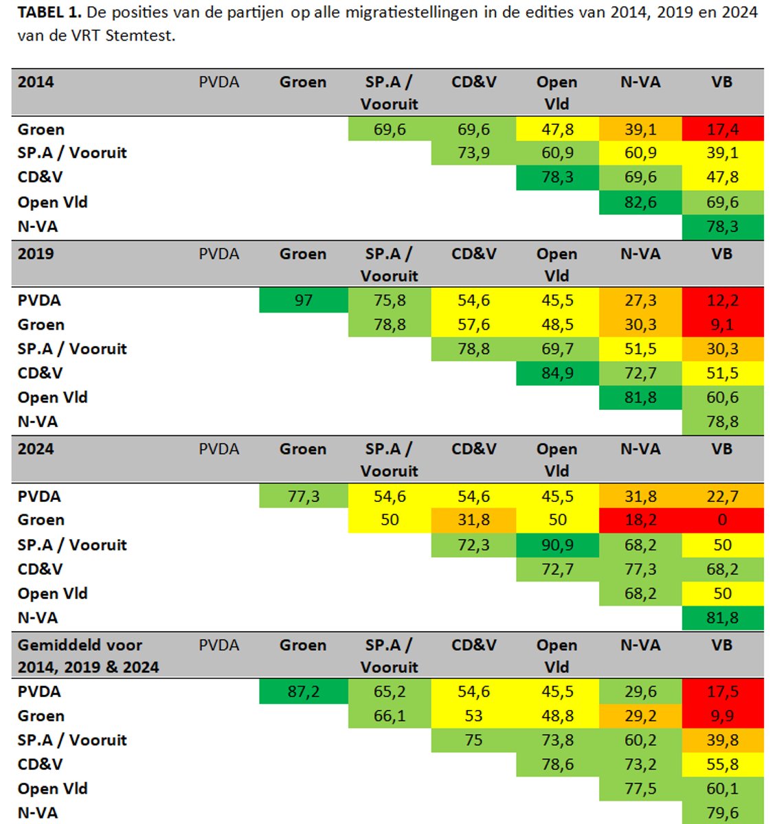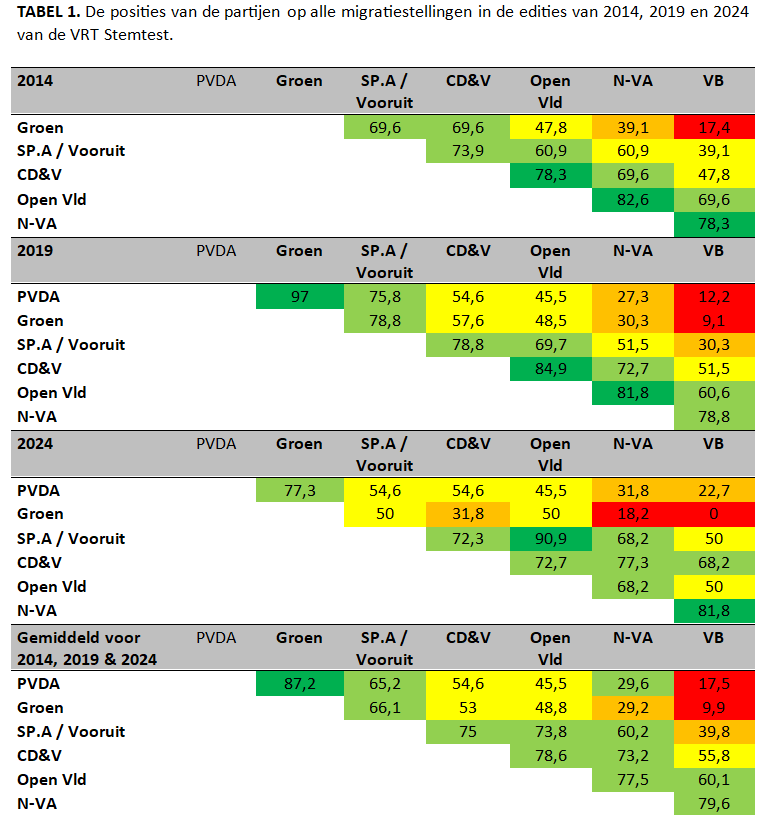Tussen 2014 en 2019 was er nog een daling in congruentie tussen de migratiestandpunten van de meeste partijen en Vlaams Belang. Tussen 2019 en 2024 tekent zich echter de omgekeerde evolutie af: er sprake van een toename in congruentie met migratiestandpunten voor Vlaams Belang, voor alle partijen (+5.0%). Dit wordt vooral gedreven door Vooruit (+19,7%), CD&V (+16,7%) en PVDA (+10,5%). Ook N-VA komt dichter bij het standpunt van Vlaams Belang, maar de evolutie is minder uitgesproken. N-VA stond ook in 2019 al dicht bij het migratiestandpunt van Vlaams Belang. Twee partijen maakten net de omgekeerde beweging: Open Vld (-10,6%) en Groen (-9,10%). Zij staan in 2024 minder dicht bij Vlaams Belang dan in 2019. Het dominante beeld is echter één van toenemende normalisering van radicaal-rechtse standpunten over migratie, gemeten op basis van de VRT Stemtest.