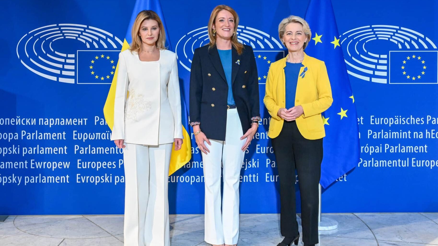 Ursula Von der Leyen roept ‘Slava Ukraini’ in blauw-gele outfit voor het Europees Parlement, maar het lijkt ondenkbaar dat ze getooid in de keffiyeh ‘Free Palestine’ in het Arabisch zou roepen.