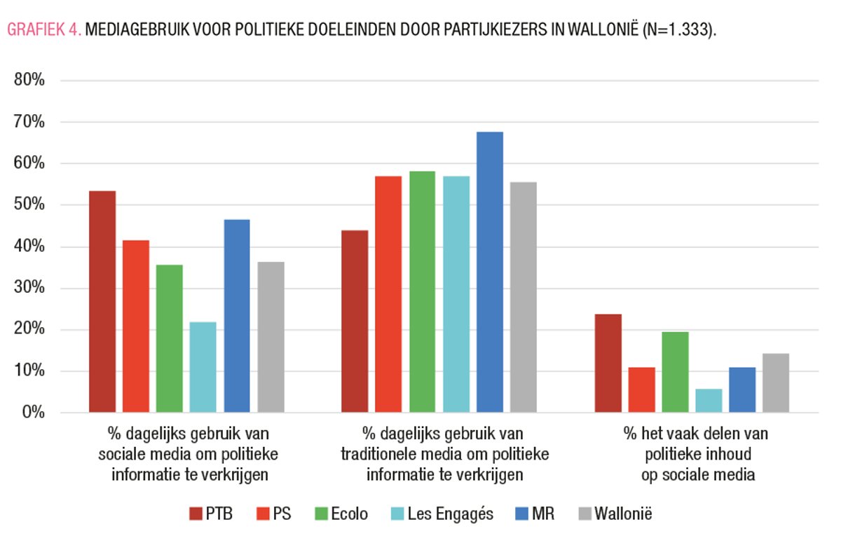 Hoewel de socialemediadiëten bij het electoraat van de Vlaamse partijen twee logica’s lijken te volgen – traditionele versus de radicale (en andere) partijen, en links versus rechts –, zijn deze logica’s niet duidelijk in Wallonië. De twee partijen die eruit springen zijn MR en PTB: hun kiezers zijn aanwezig op alle platformen en informeren zich meer op sociale media dan andere partijkiezers.