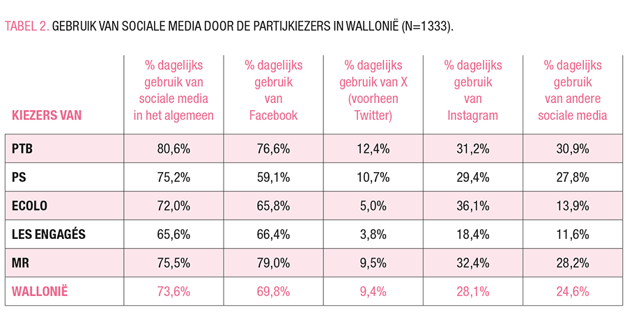 Opvallend is dat Waalse kiezers aangeven vaker actief te zijn op sociale media in vergelijking met Vlamingen (73,6% versus 63,5%). De gerapporteerde dagelijkse gebruikspercentages zijn hoger bij de Waalse respondenten op alle platformen, maar de kloof is vooral zichtbaar op Facebook (TABEL 2). De links-rechtsscheiding geldt niet op dezelfde manier als in Vlaanderen. We zien ook geen kloof tussen de traditionele verzuilde partijkiezers en de anderen. Kiezers van Les Engagés lijken minder frequent gebruik van sociale media in het algemeen te melden, en dit is zichtbaar voor X, Instagram en andere platformen. PS-kiezers lijken het minst geneigd om Facebook te gebruiken (59%), maar ze zitten iets boven het gemiddelde voor X, Instagram en andere platformen. 79% van de MR-kiezers meldt een dagelijks gebruik van Facebook, wat 10% boven het gemiddelde ligt – en 20% boven de PS-kiezers. Net als de kiezers van hun zusterpartijen over de taalgrens heen, rapporteren Ecolo- en PTB-kiezers dagelijks meer gebruik van Instagram dan de gemiddelde Waalse kiezer. Dit is ook het geval voor MR-kiezers – in tegenstelling tot haar zusterpartij Open Vld. Net als PVDA-kiezers staan PTB-kiezers op de eerste plaats wat betreft het gebruik van ‘overige’ platformen (31%).