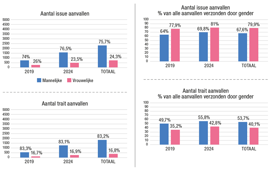 Bij trait-based aanvallen is het omgekeerde zichtbaar. Slechts 16,8% van alle trait-based aanvallen werd door vrouwen verstuurd, met een licht stijgende trend van 16,7% in 2019 naar 16,9% in 2024. Mannen waren verantwoordelijk voor 83,2% van deze aanvallen, met een aandeel van 83,3% in 2019 en 83,1% in 2024. Relatief gezien bestond in 2019 35,2% van de aanvallen van vrouwelijke politici uit trait-based aanvallen, een percentage dat in 2024 steeg naar 42,8%. Bij mannen was dit aandeel hoger, met 49,7% in 2019 en 55,8% in 2024.