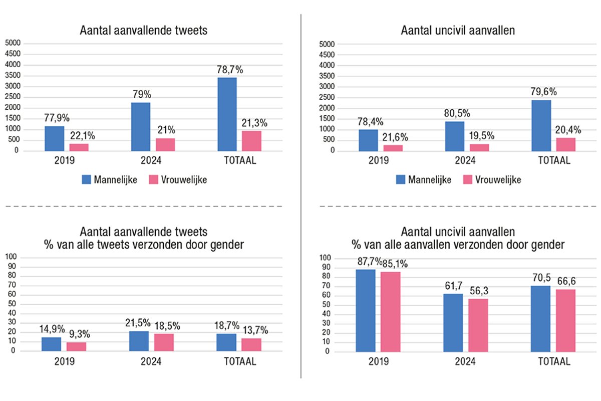 In 2019 bevatte 13% van de tweets een aanval (1.490 tweets), terwijl dit aandeel in 2024 steeg naar 20,8% (2.867 tweets).