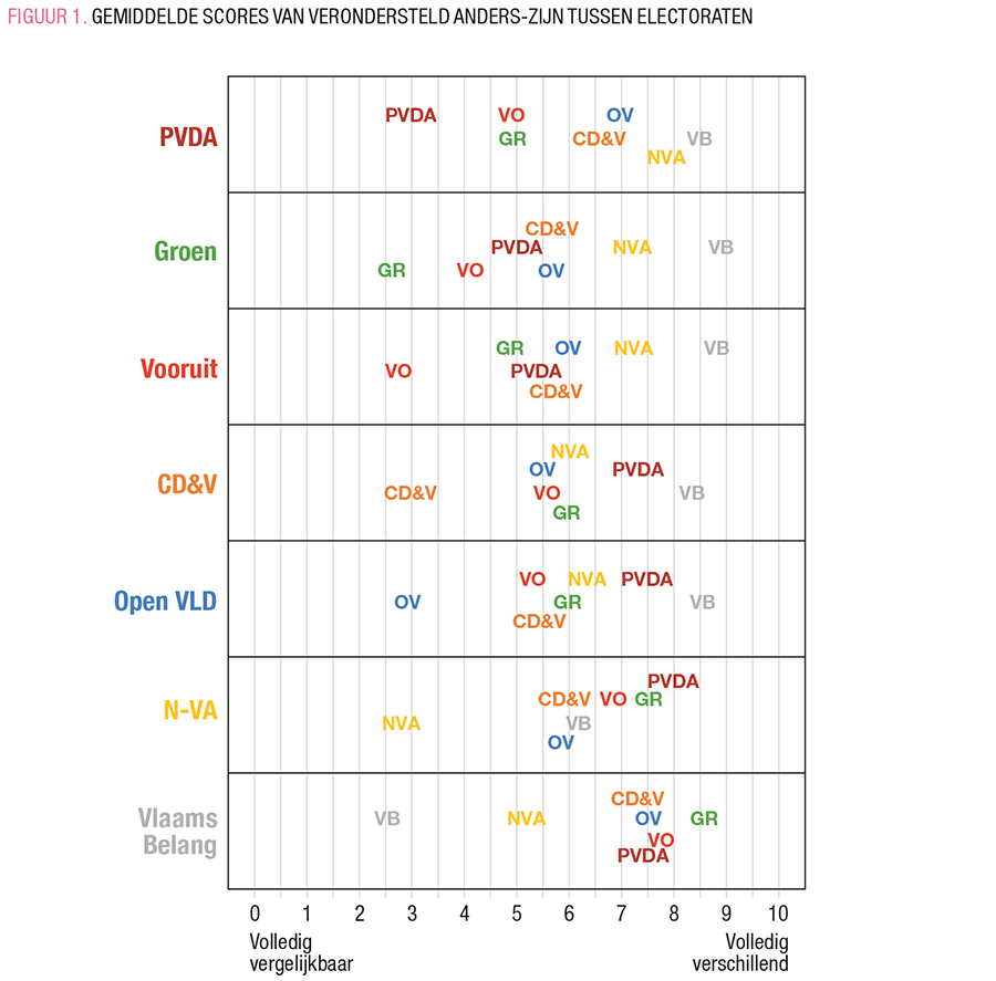 Vooral de kiezers van Vlaams Belang worden door bijna alle kiezers gezien als zeer verschillend van hen, met uitzondering van de N-VA-kiezers.