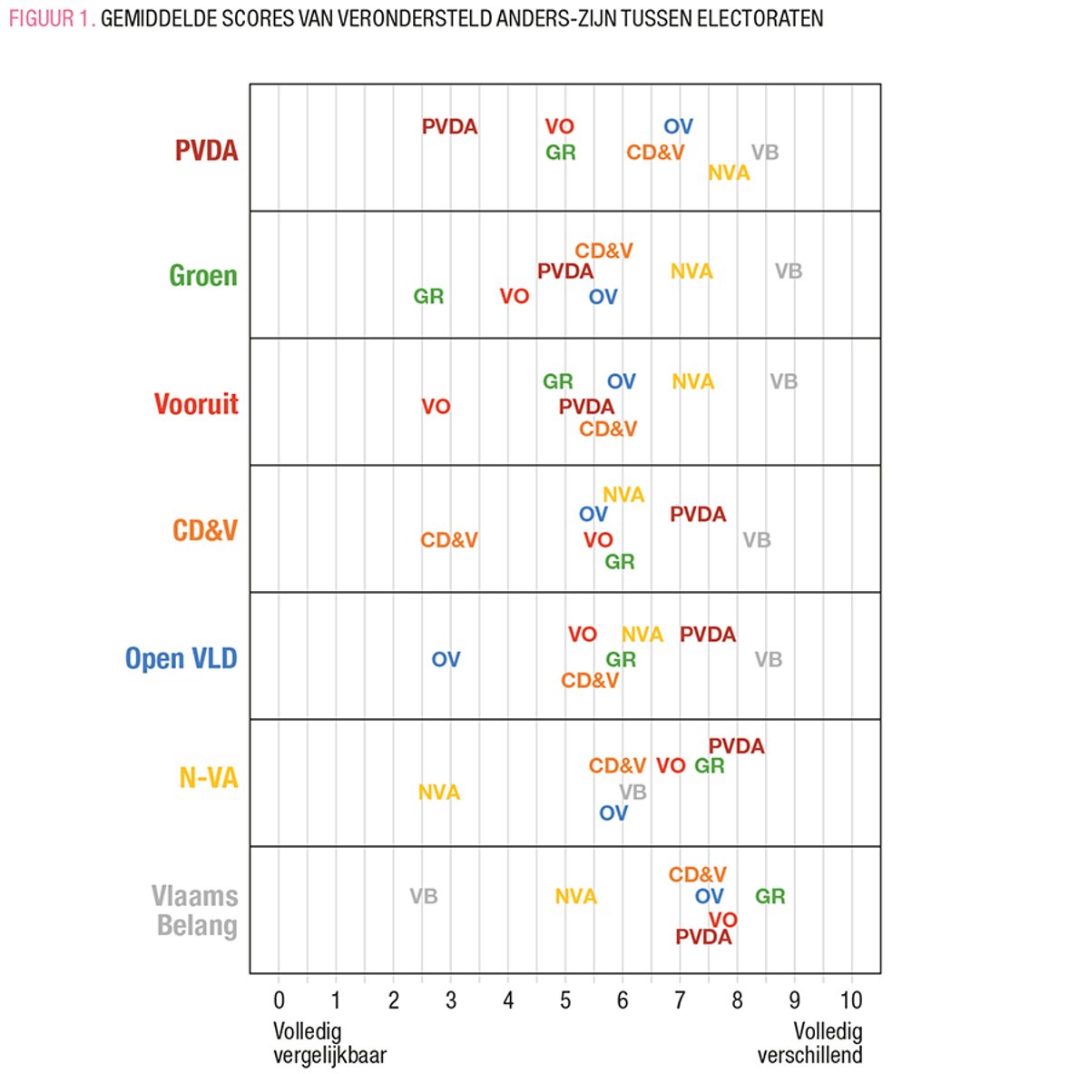 Dit wordt duidelijk in FIGUUR 1, die de gemiddelde scores van verondersteld anders-zijn weergeven, voor de aanhangers van elke partij (de partijen die op de y-as staan, aan de linkerkant van de figuur). Als we bijvoorbeeld kijken naar de eerste lijn helemaal bovenaan in FIGUUR 1, dan zien we dat PVDA-kiezers andere PVDA-aanhangers als het meest gelijkaardig aan zichzelf beschouwen, terwijl ze Vlaams Belang- en N-VA-aanhangers als het meest verschillend beschouwen. Tegelijkertijd zien ze Vooruit- en Groen-kiezers als noch bijzonder gelijkend noch verschillend van zichzelf.