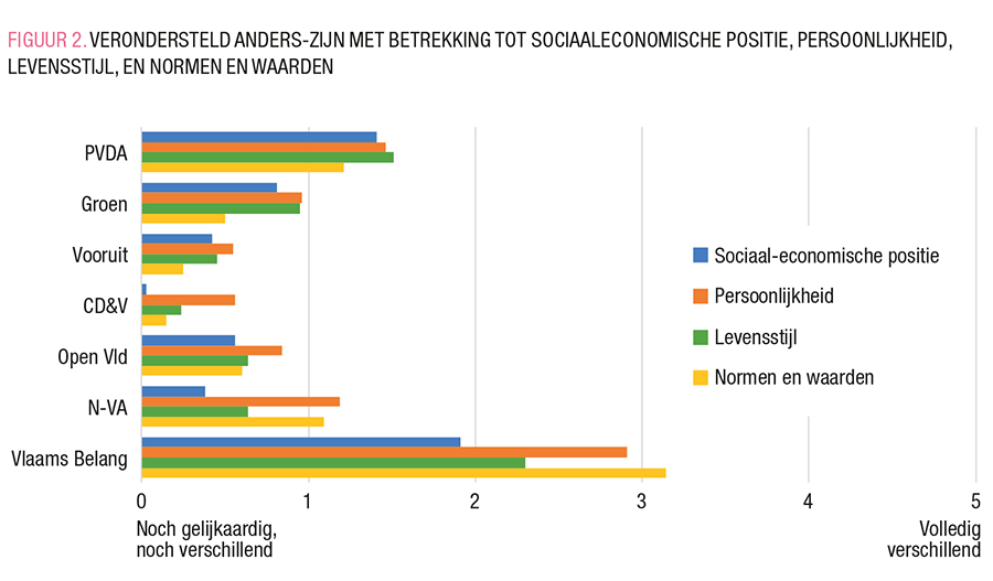 Bovendien tonen deze bevindingen dat kiezers van de uiterst linkse en uiterst rechtse partijen (PVDA op links en Vlaams Belang op rechts) als meest verschillend beschouwd worden op niet-politiek vlak. Vooral de kiezers van Vlaams Belang, de meest rechtse (en enige radicaal-rechtse) partij in het Vlaams parlement, worden door bijna alle kiezers gezien als zeer verschillend van hen, met uitzondering van de N-VA-kiezers: zij zien de doorsnee Vlaams Belang-kiezer als eerder licht verschillend van zichzelf (gemiddelde score van 6,2/10 op de schaal van anders-zijn).