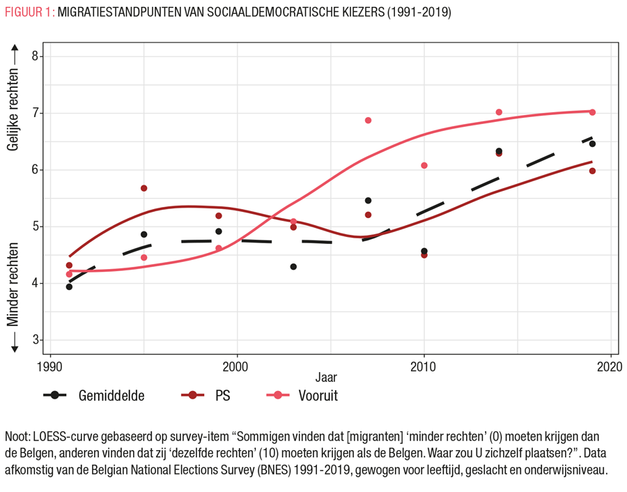 Om het electorale succes van beide migratiestandpunten te evalueren, vormt België een interessant politicologisch laboratorium. Zowel PS als Vooruit varen als principiële voorstanders van migratie een cultureel universalistische koers, maar PS is er veel beter in geslaagd om de electorale steun van de arbeidersklasse te behouden. Het leidt tot de bijzondere constellatie dat – hoewel PS zich inzake culturele thema’s doorgaans even progressief opstelt – haar kiezers ideologisch net een stuk conservatiever zijn dan die van Vooruit.