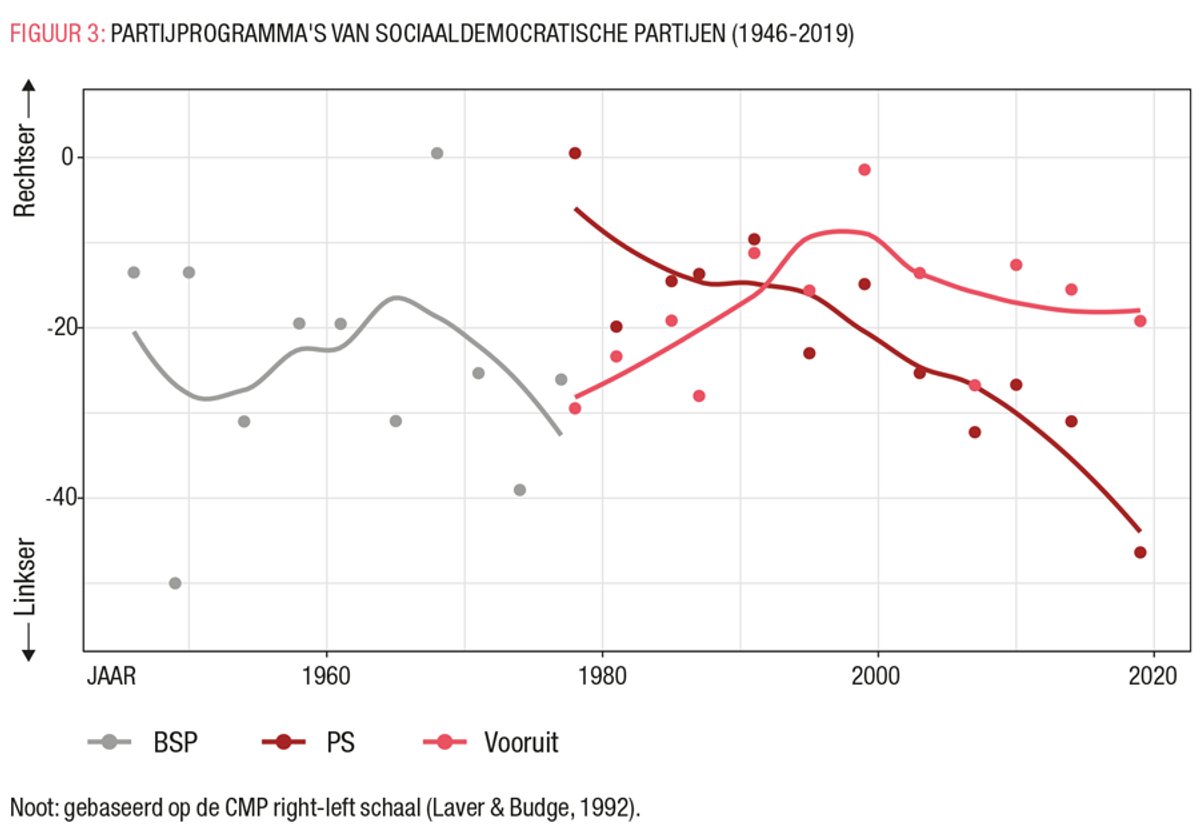 Anders dan PS heeft Vooruit die boodschap niet begrepen. Zoals een evaluatie van partijprogramma’s uit het Comparative Manifesto Project (FIGUUR 3) aangeeft, is de partij zich rond de eeuwwisseling steeds rechtser gaan opstellen. Vanaf het aantreden van het paars-groene kabinet-Verhofstadt I begonnen de Vlaamse sociaaldemocraten zich steeds meer te richten op activerend arbeidsmarktbeleid en een sociale investeringslogica. Daarmee hoopte de toenmalige SP een brug te slaan tussen het liberalisme en de sociaaldemocratie, in een poging om meer kiezers uit de middenklasse te overtuigen.