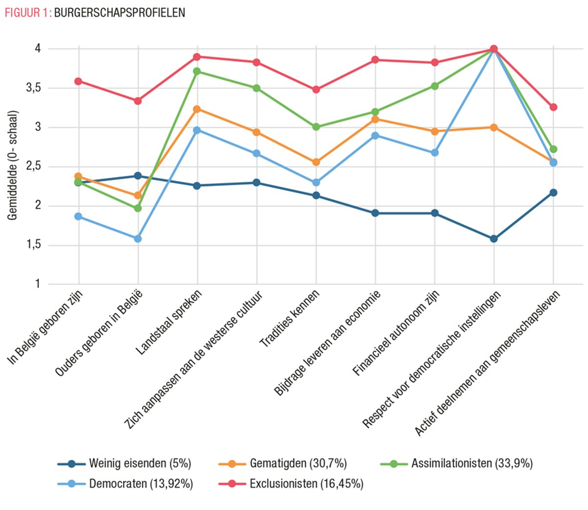 - Daartegenover staan de exclusionisten (iets meer dan 16% van de steekproef). Zij vinden alle voorgelegde voorwaarden voor burgerschap, inclusief de etnische criteria, belangrijk. Dit is de enige groep die de nadruk legt op de etnische invulling van burgerschap. Voor hen geldt duidelijk het idee dat “België toebehoort aan de Belgen”: volgens hen moet je Belgische ouders hebben én in België geboren zijn om Belg te kunnen zijn – eisen die migranten per definitie uitsluiten van burgerschap.