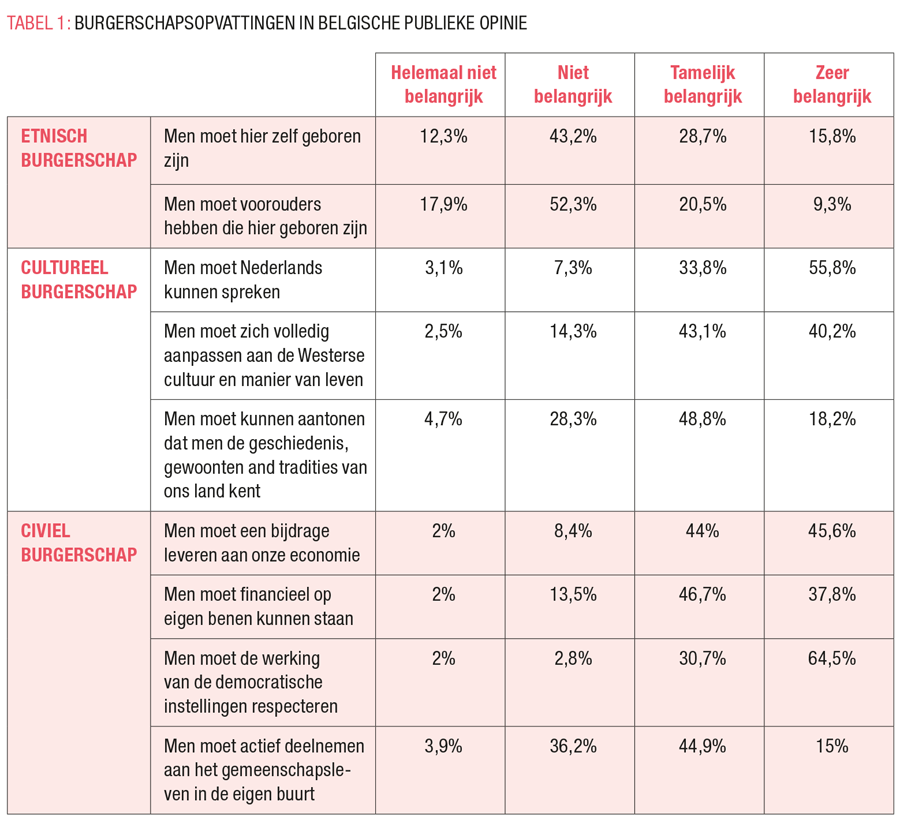 44% vindt het 'tamelijk tot zeer belangrijk' dat men in België geboren moet zijn en 30% dat men 'ouders moet hebben die in België geboren zijn'.